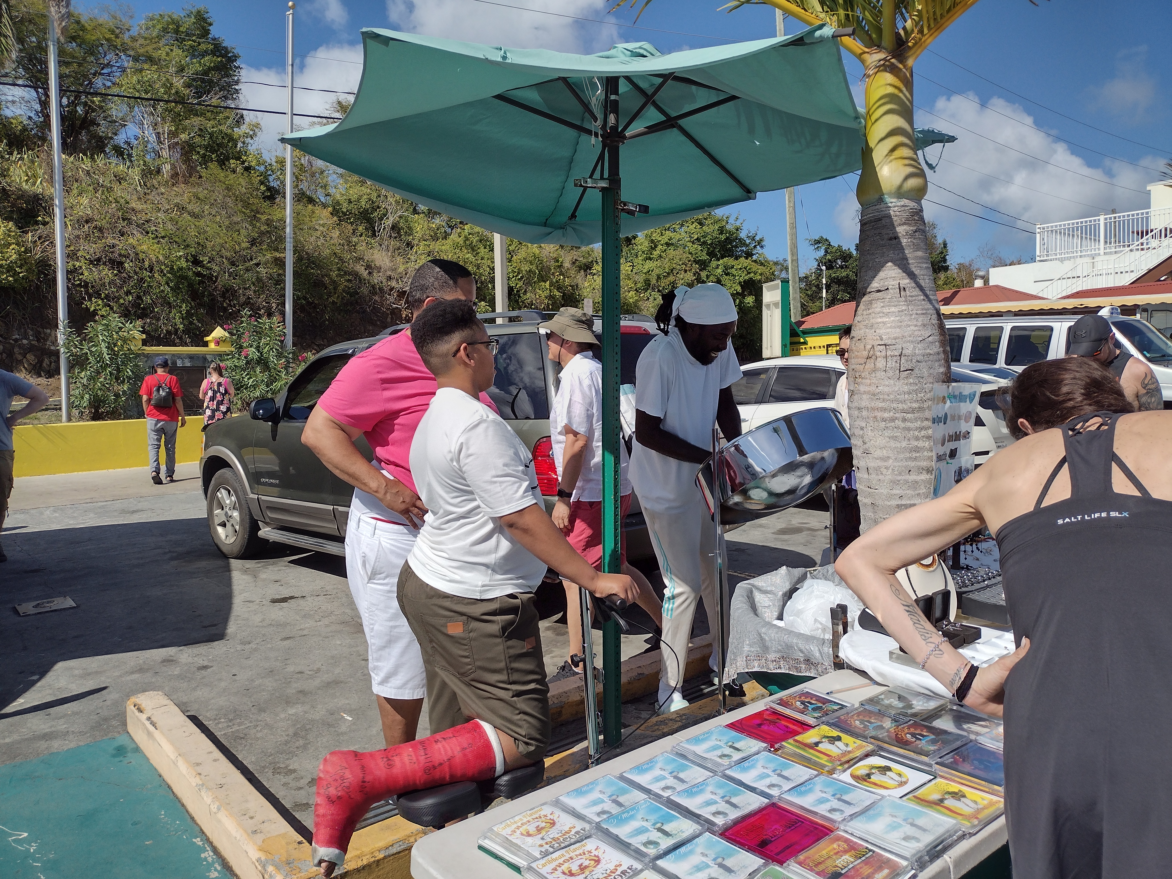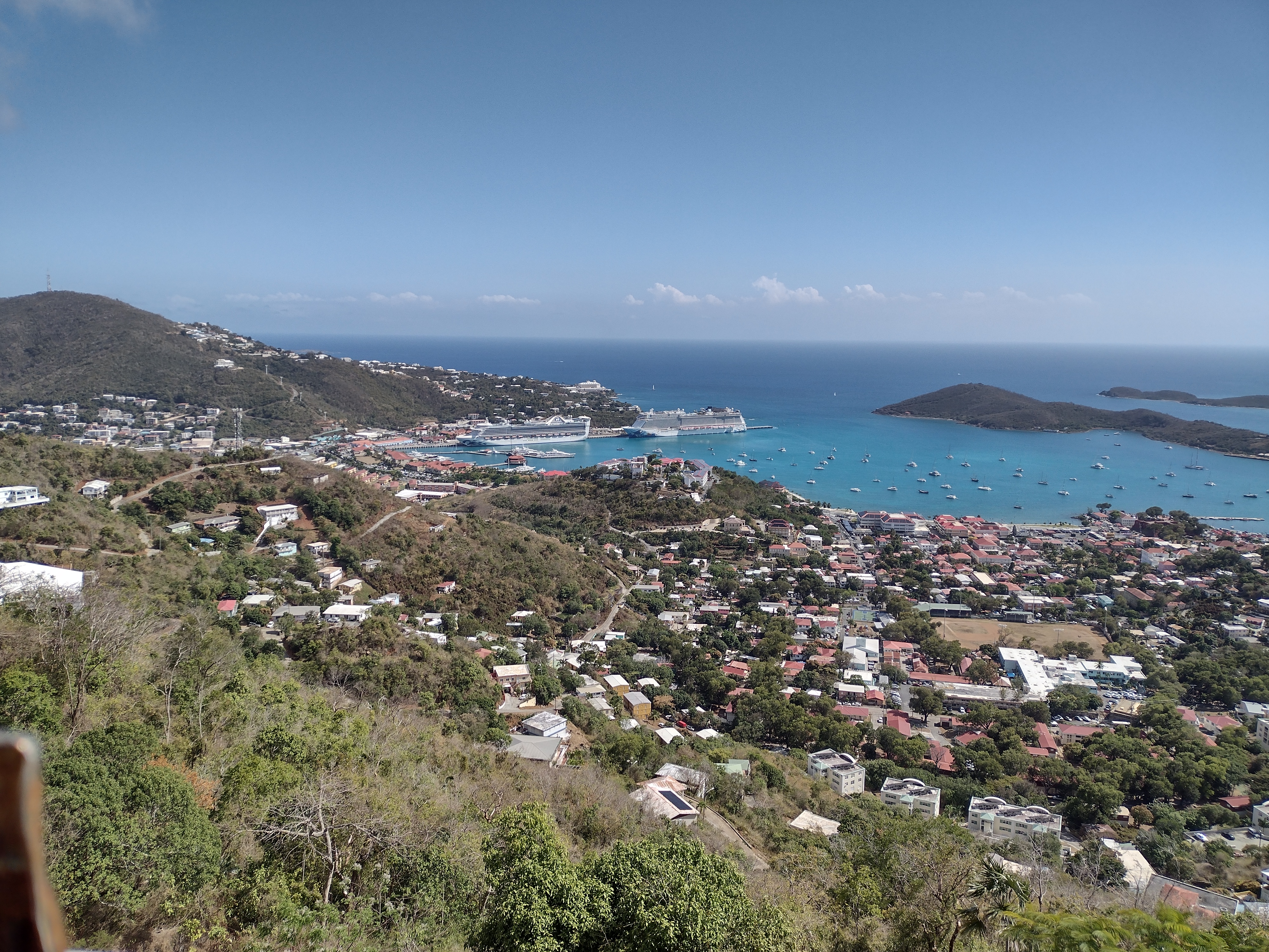 Slept late because forgot to set the alarm, so I missed breakfast. Had lunch in the buffet—an open face tuna sandwich and tabouleh salad. Today’s port is St. Thomas, USVI. Got off the boat and headed in the sky buckets to Paradise Point (some folks from the other ship were VERY unhappy with Princess, btw). At the top are shops, a restaurant and a bar. I had their famous Bushwacker (basically a pina colada with Bailey’s and some chocolate).