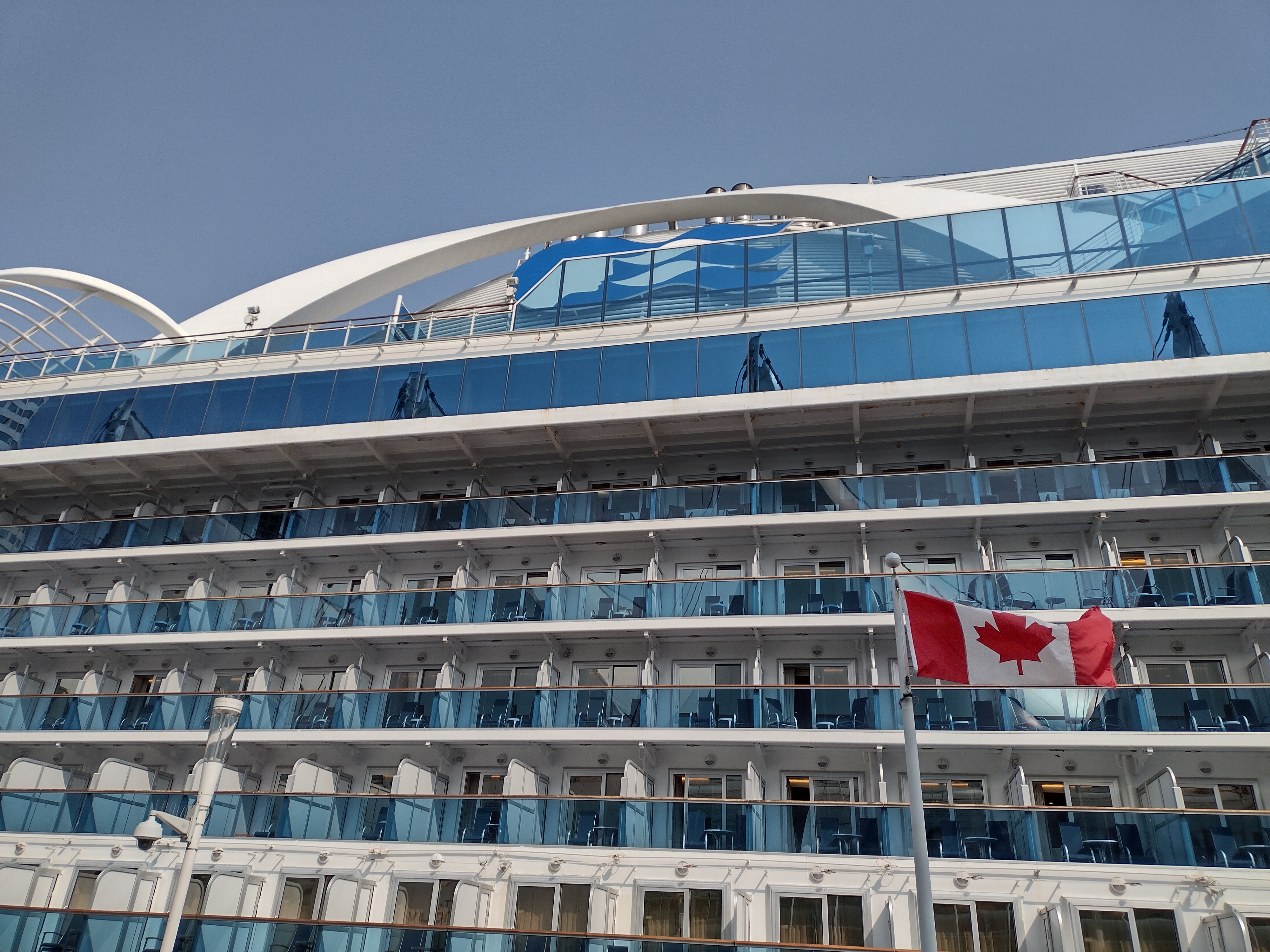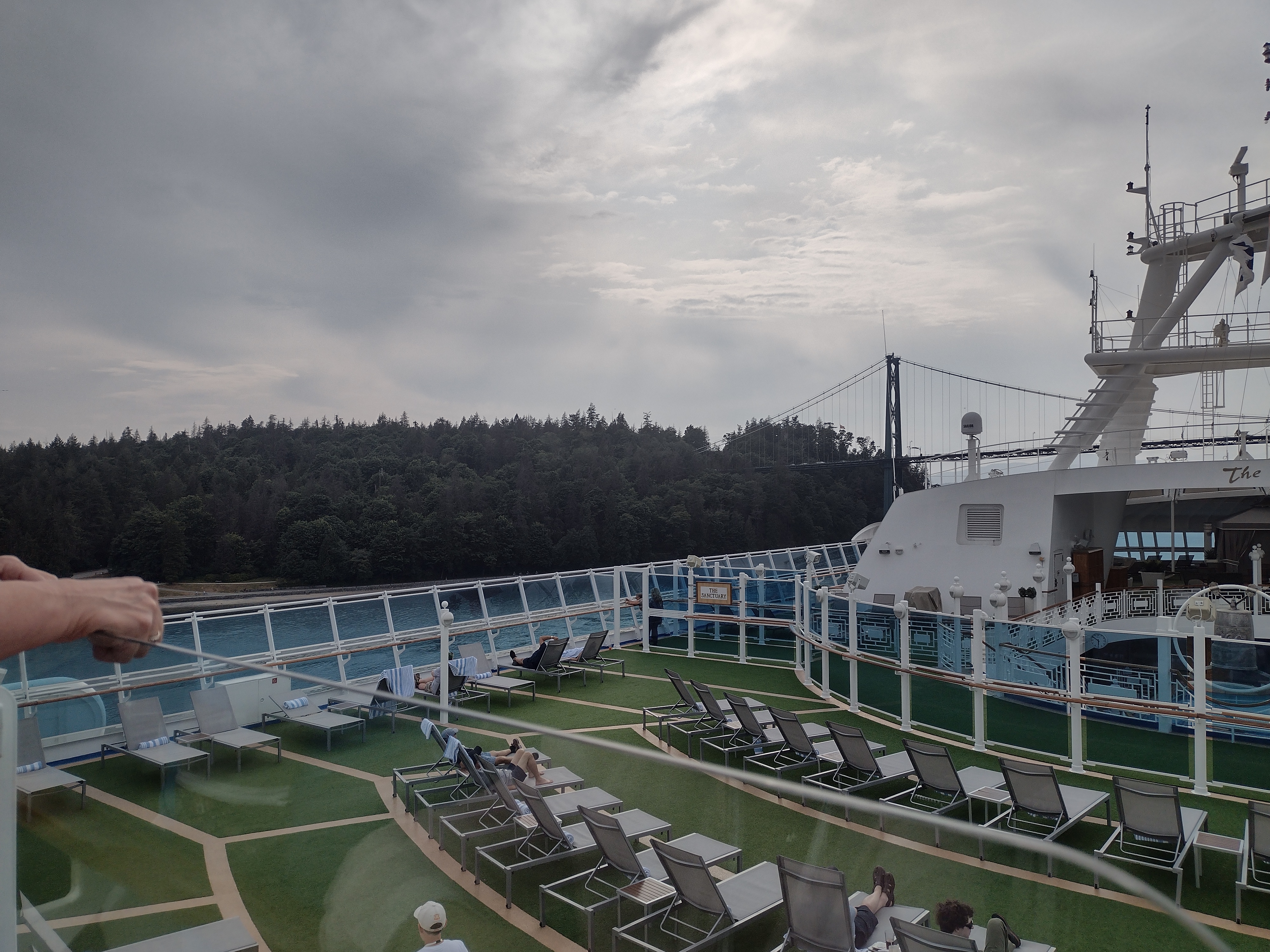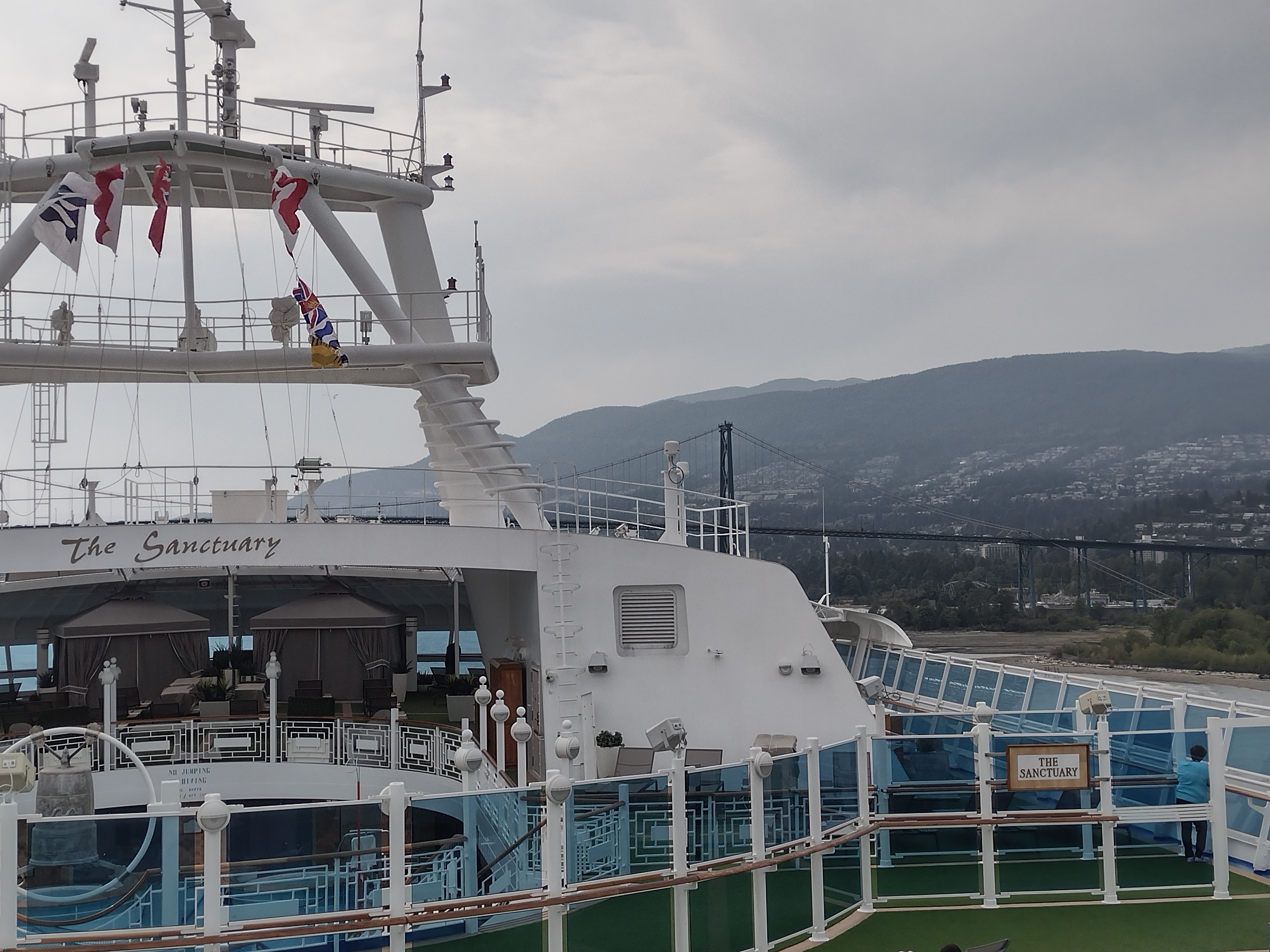 After lunch, I headed to my room with was nice with a huge window. Suitcase hadn’t arrived yet, so I went to the “welcome to Princess” meeting with our cruise director Kristoff. Afterward, I headed to a top deck for sailaway. I found a spot to sit near the railing facing forward. A guy was eating pizza and a large seabird started stalking it. I took a group photo for some drunk people. I met a couple of women from Vancouver Island who were great –one of them even said “eh” at the end of all her sentences like the stereotype.