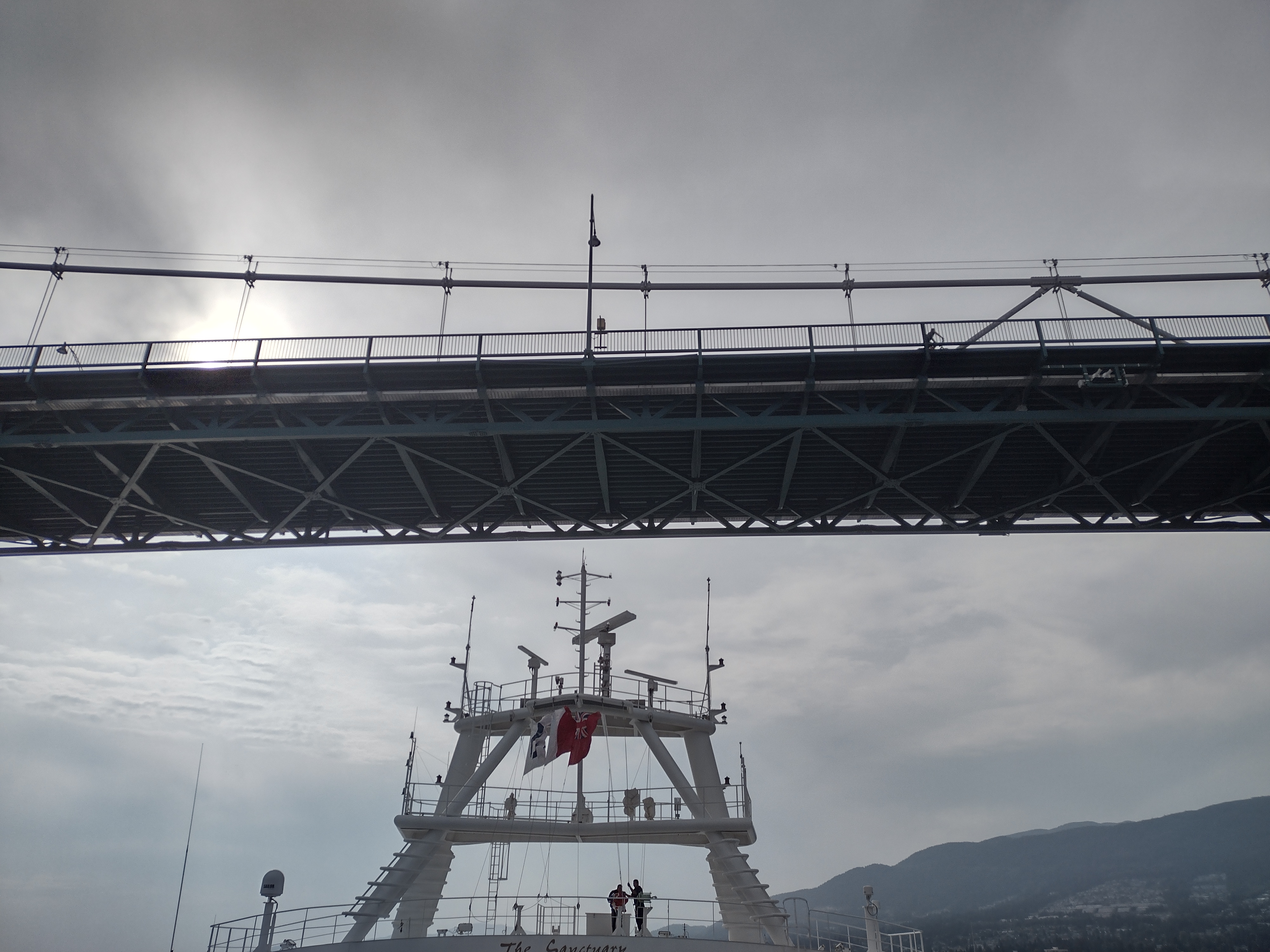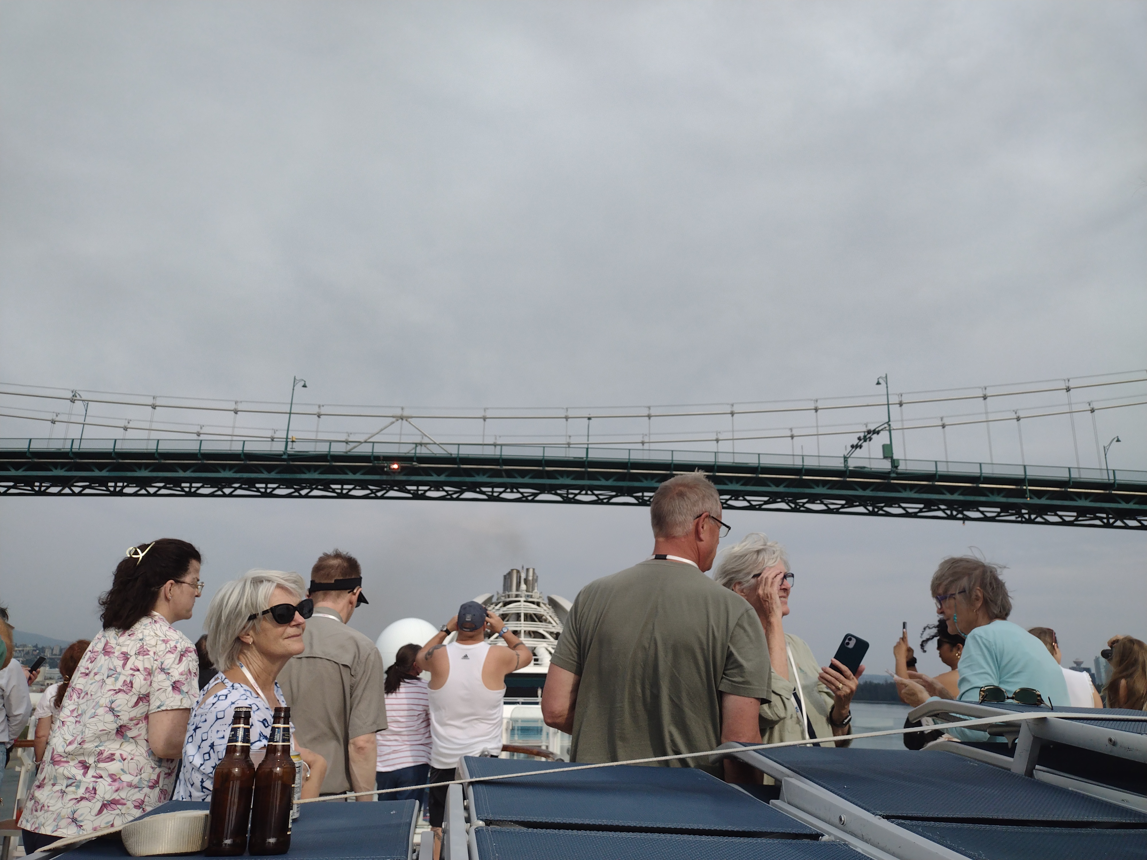 The mom had not cruised in about 20 years or so, and she and her husband (now deceased) had always talked about Alaska, and she was finally doing it. She gave me info about the stuff we were seeing as we left—so very beautiful—we even sailed right under a bridge (literally just a few feet below!